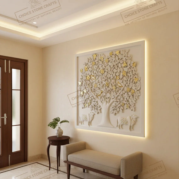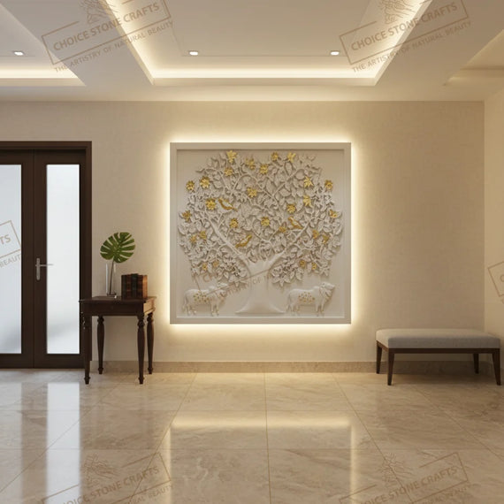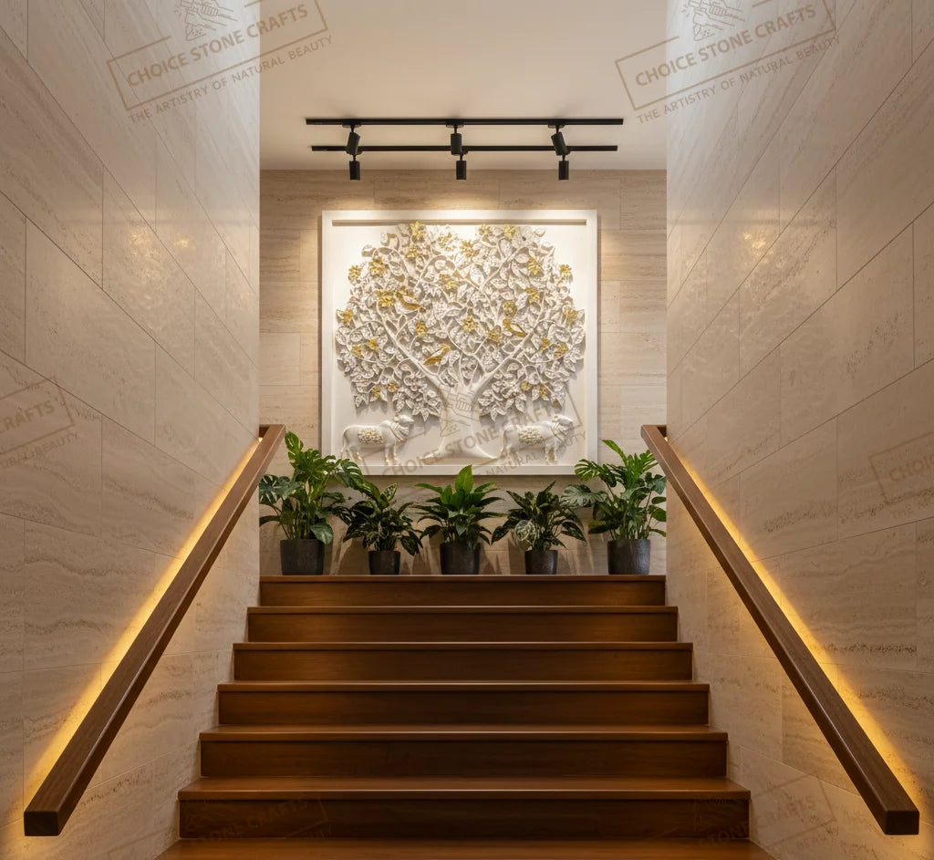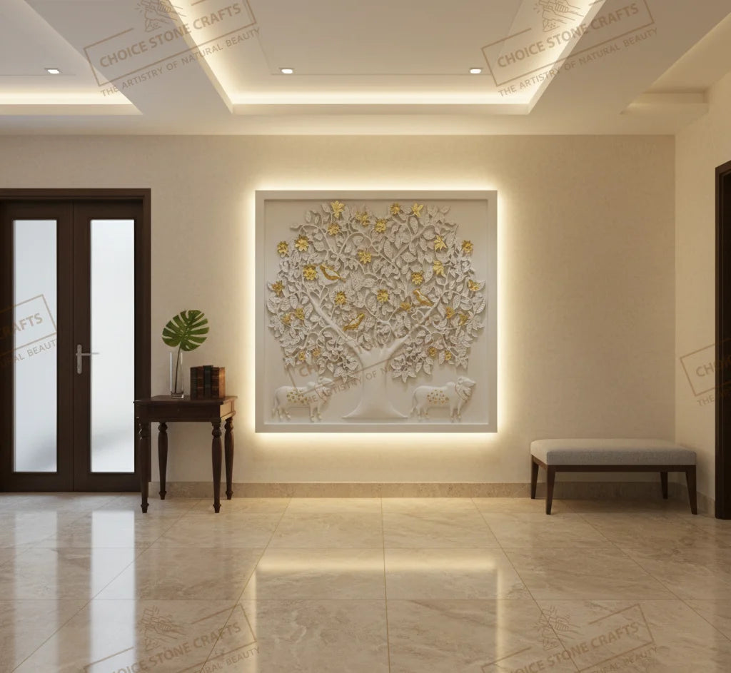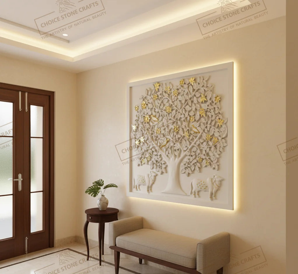 | RECOMMENDED FOR: This Kamadhenu Cow with Kalpavriksha Tree natural stone mural is ideal for installation on living room feature walls, pooja rooms, entrance foyers, dining statement walls, staircase walls, central courtyards, home libraries, meditation rooms, villa lobbies, hotel lobbies, temple corridors, and resort reception areas, creating a calm, auspicious, and premium architectural focal point wherever it is placed. |