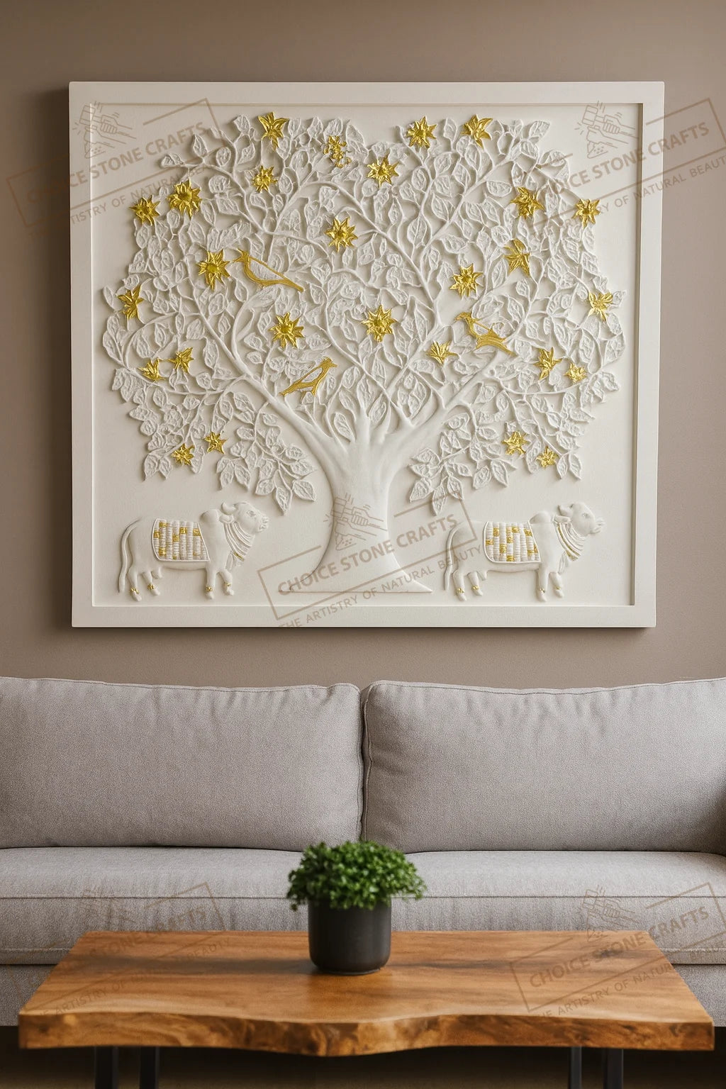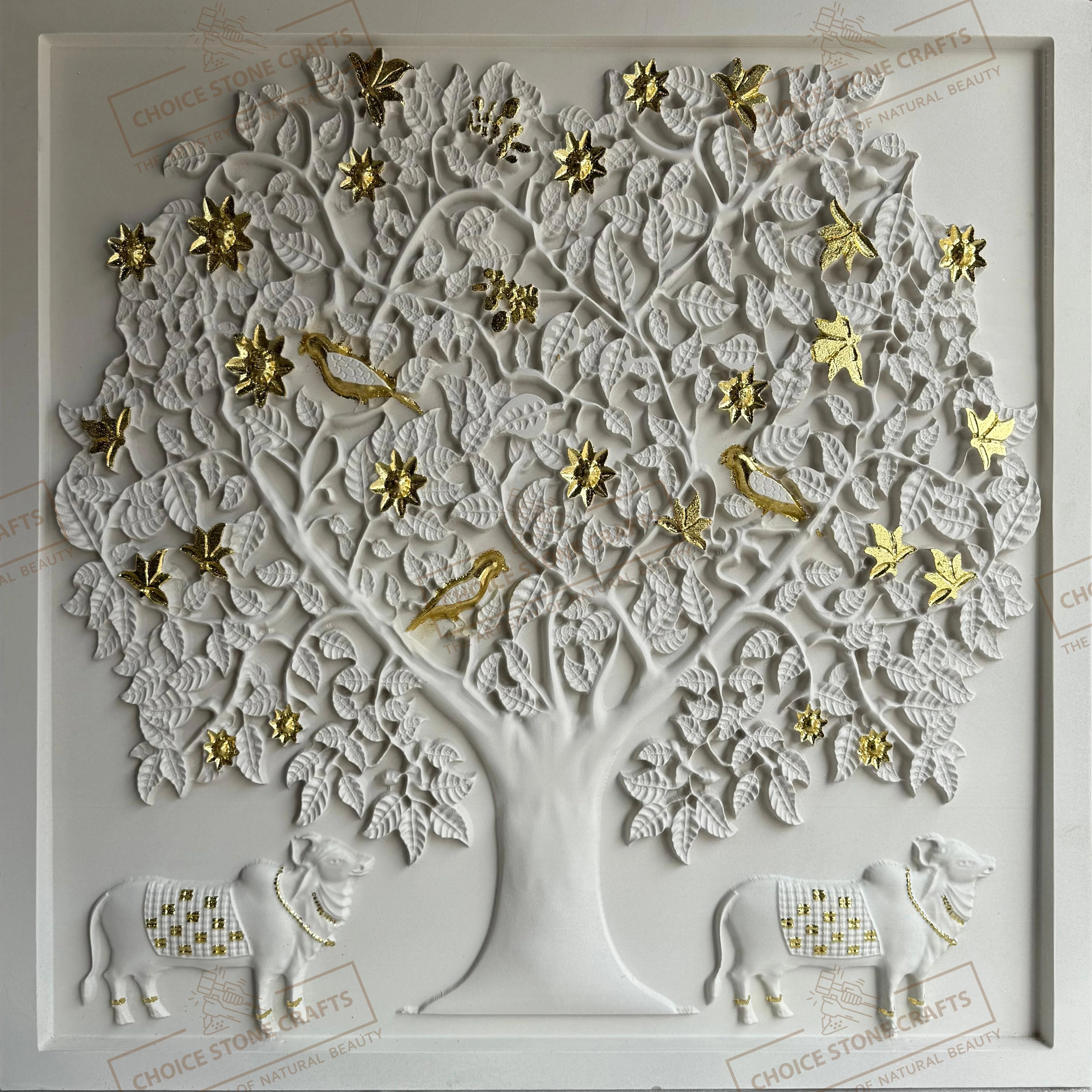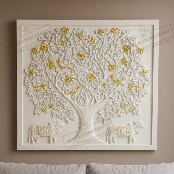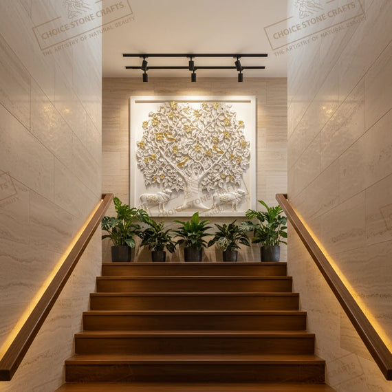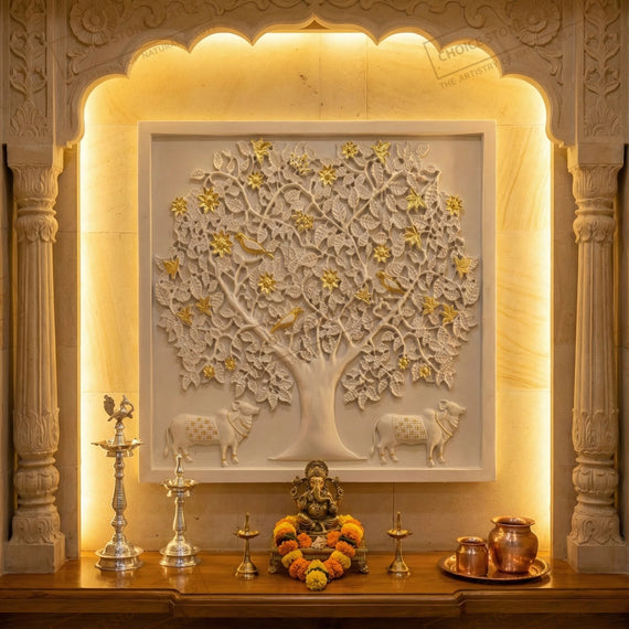 | RECOMMENDED FOR: This Kamadhenu Cow with Kalpavriksha Tree natural stone mural is ideal for installation on living room feature walls, pooja rooms, entrance foyers, dining statement walls, staircase walls, central courtyards, home libraries, meditation rooms, villa lobbies, hotel lobbies, temple corridors, and resort reception areas, creating a calm, auspicious, and premium architectural focal point wherever it is placed. |