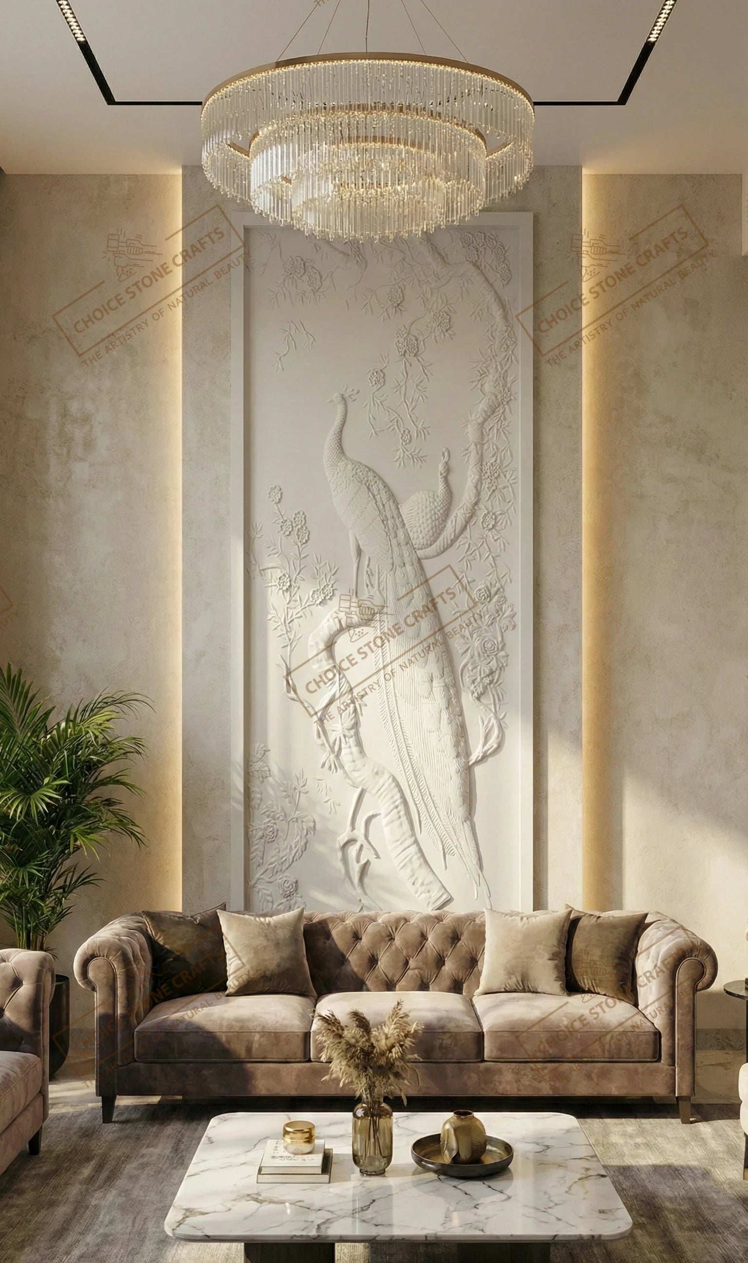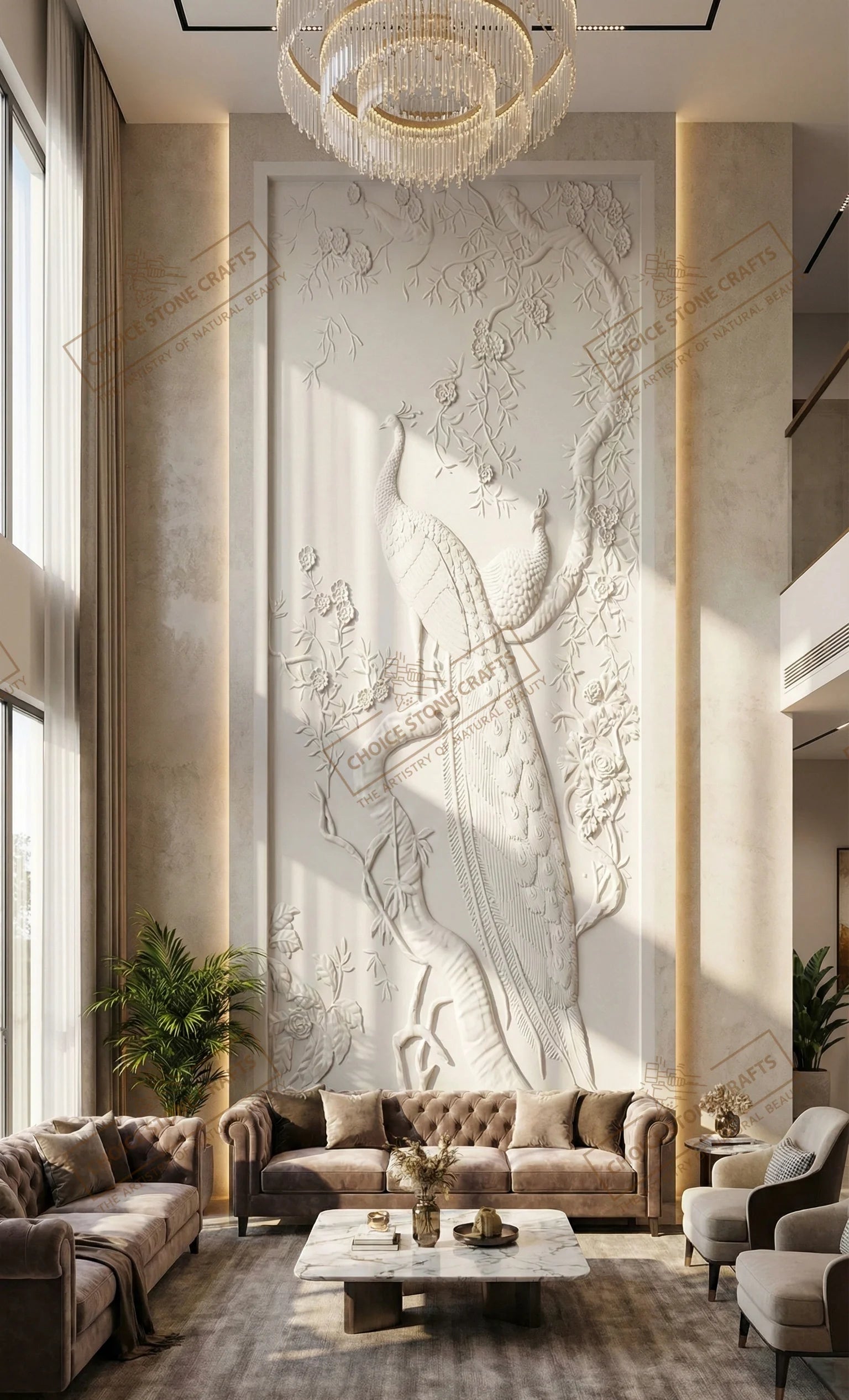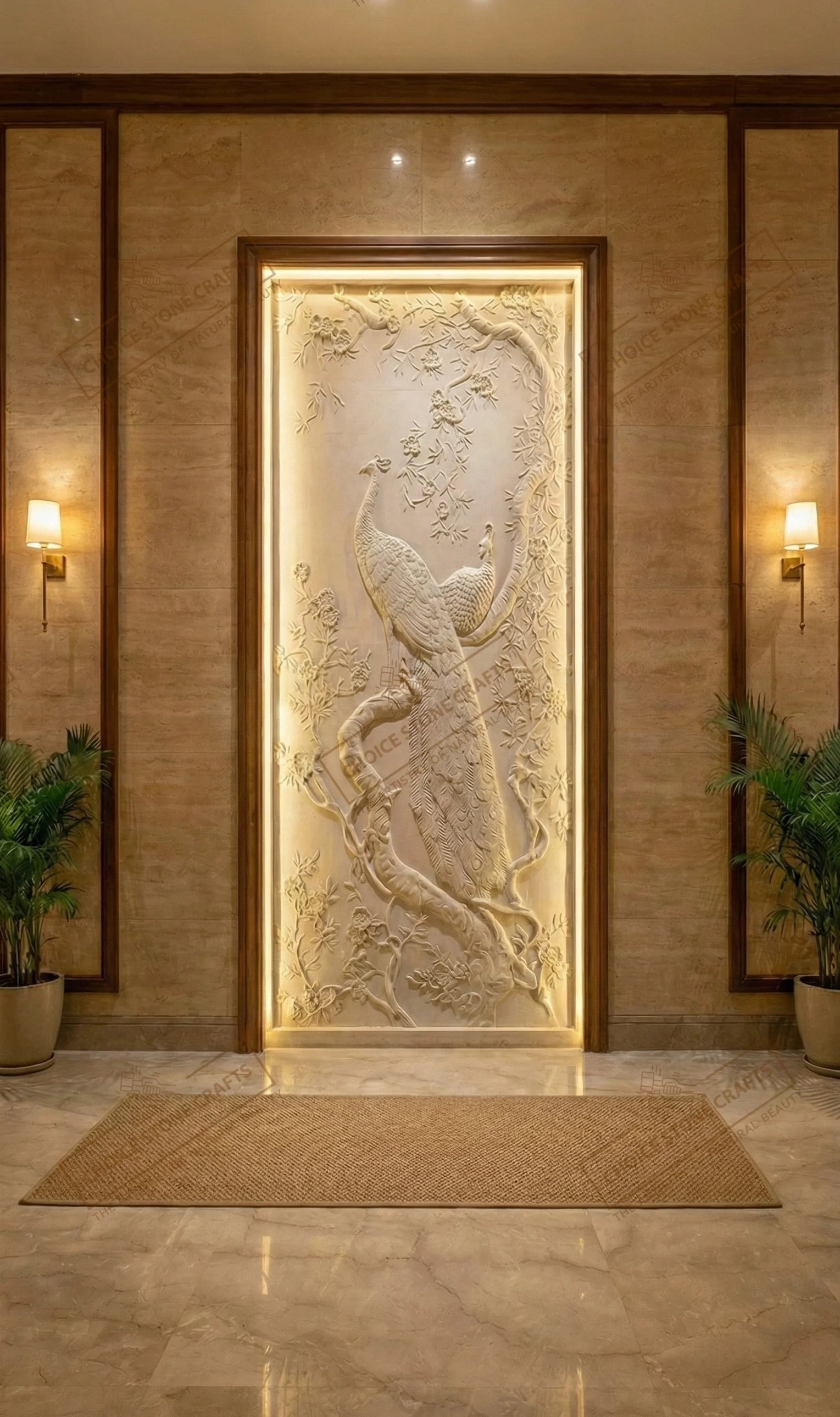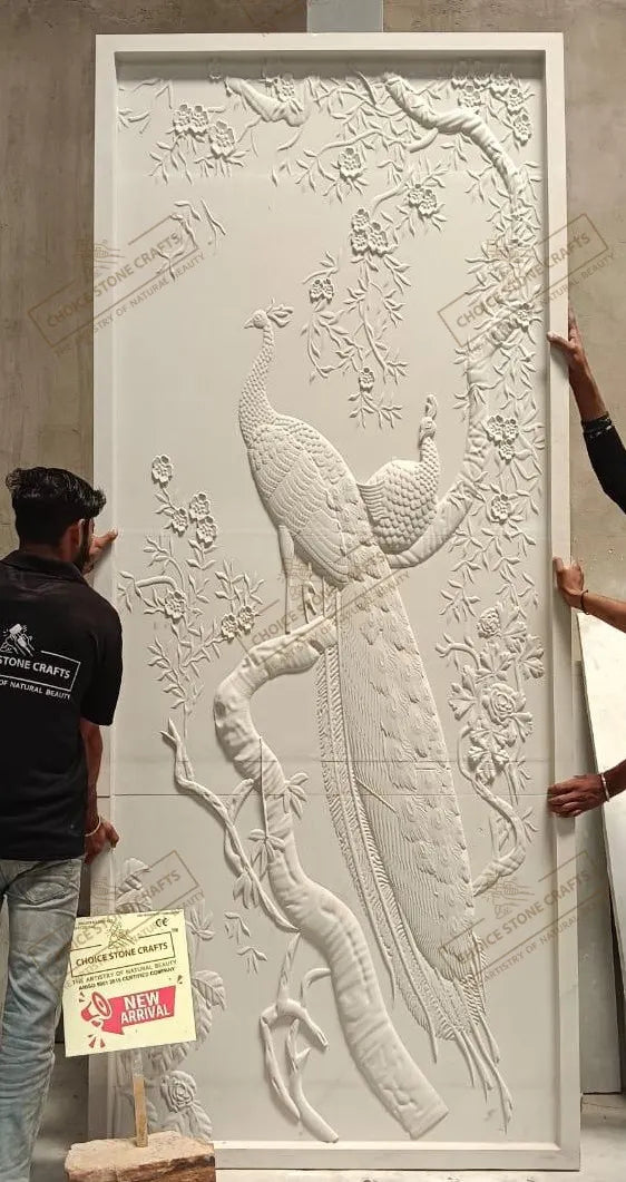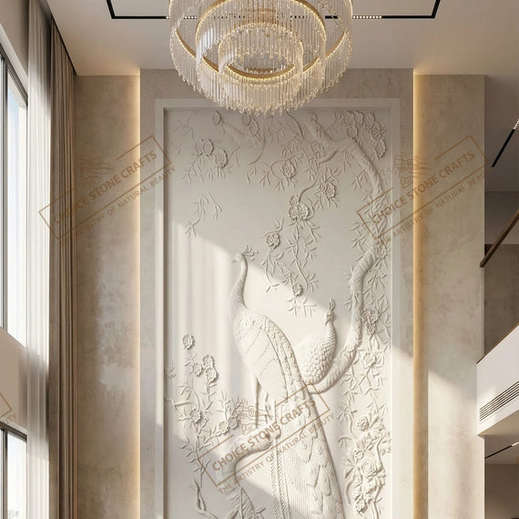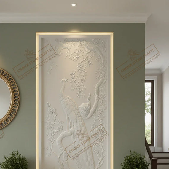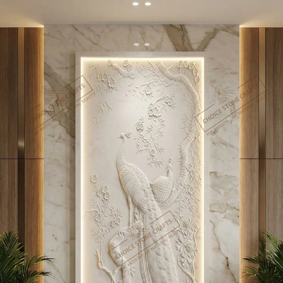 RECOMMENDED FOR: This Peacock Natural Stone Wall Mural can be installed on an entry foyer feature wall, double-height living room wall, formal drawing room accent wall, reception or waiting area wall, hotel lobby feature wall, luxury villa interior wall, resort lobby or corridor wall, premium office reception wall, or any large interior statement wall where a refined and artistic focal point is required. |